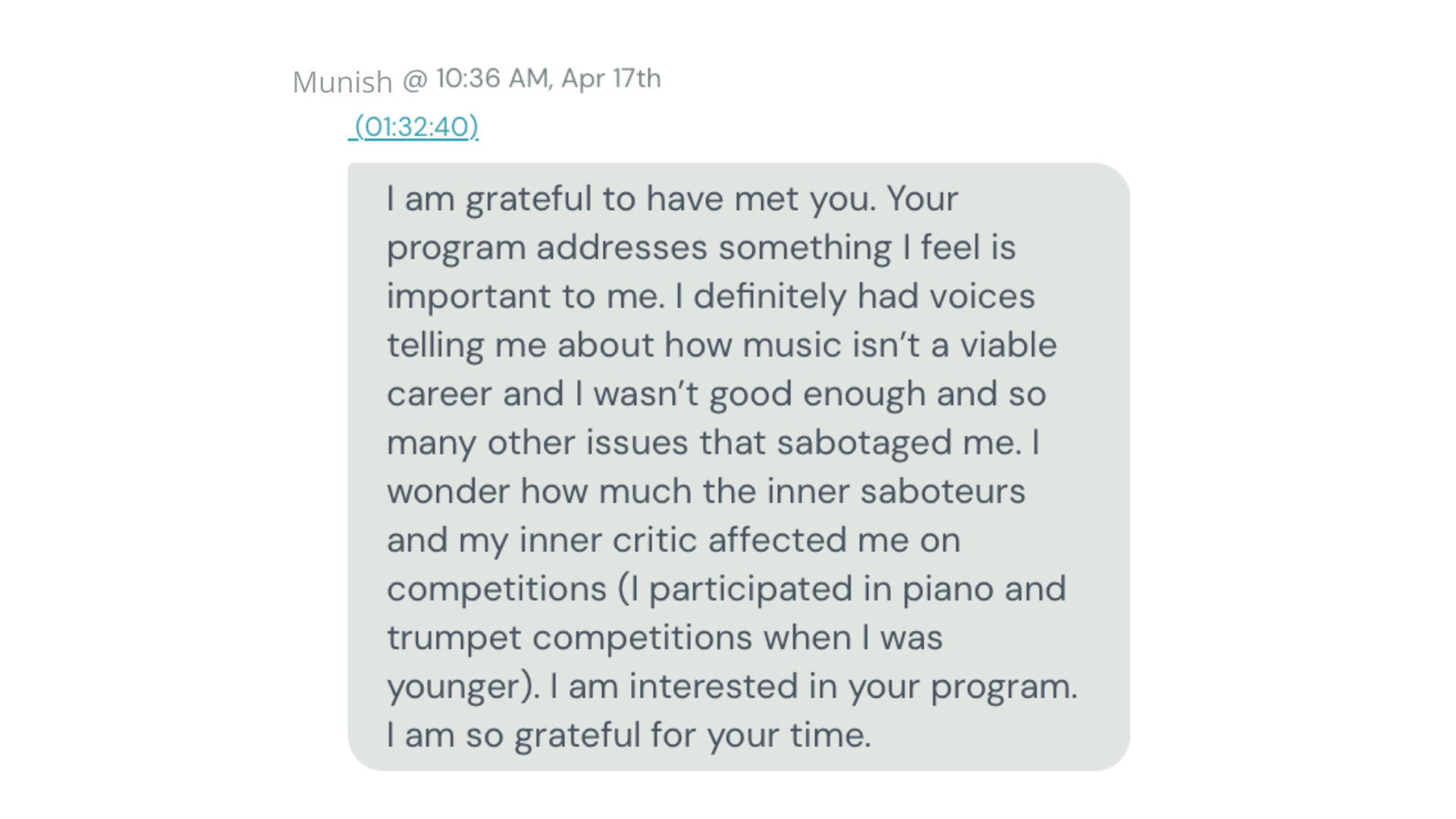 As a Voice Teacher and Mindset Coach, I work with artists that are ready to be free from that inner judge so that they are able to take more risks, prioritize themselves, and experience creative freedom.